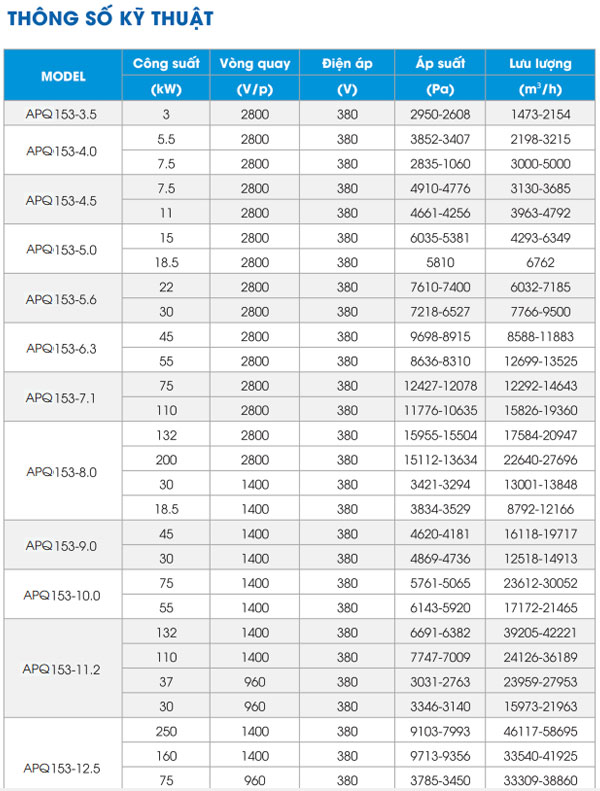 Dòng quạt APQ-153 sở hữu 14 model với công suất hoạt động, cột áp và lưu lượng gió khác nhau, phục vụ từng nhu cầu sử dụng và từng môi trường cụ thể.